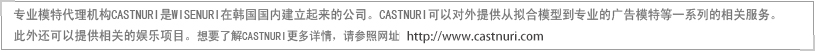 上述的CASTNURI的各服务项目是针对韩国国内设置的。国外的企业及个人如对相关项目感兴趣,或对模特报名以及模特涉外业务等事宜有疑问的话,请按照下面的联系方式联系我们,我们将真诚地给您予以回复。希望广大的顾客朋友们,多多联系。